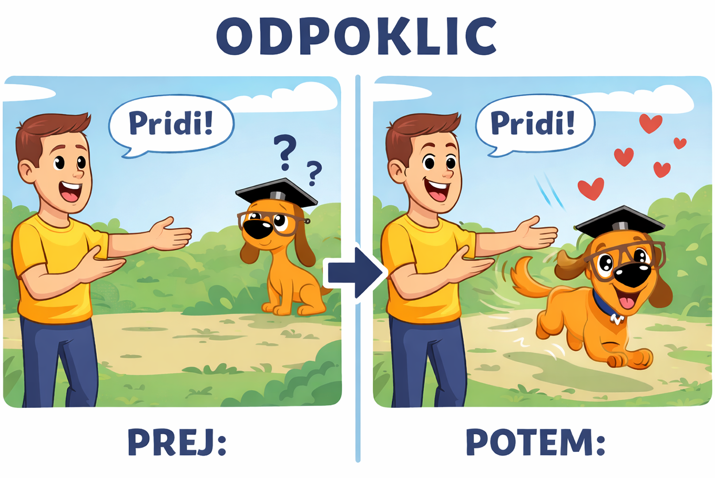 Odpoklic ni talent psa. Odpoklic je rezultat pravilnega vodenja. Odpoklic je vaja, ki v življenju psa pomeni razliko med: varnostjo in nevarnostjo, svobodo in stalnim povodcem, igro z drugimi psi in popolno omejitvijo In prav zato je odpoklic ena najpomembnejših vaj, kar jih pes kdaj potrebuje.